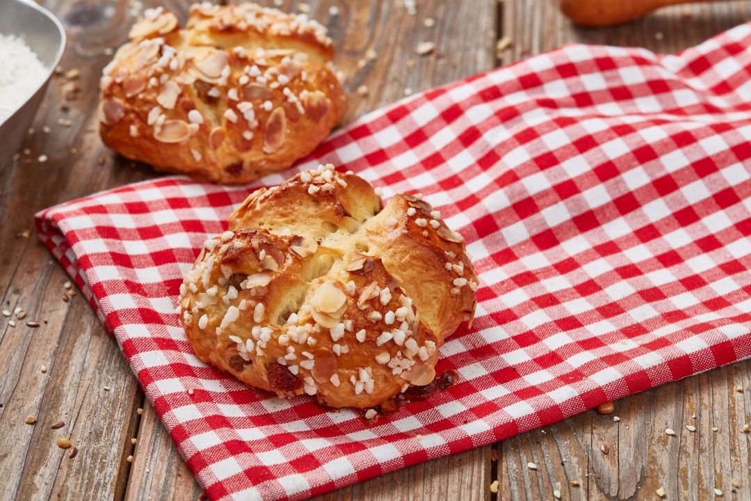 Zutaten: Mehl, Trinkwasser, Backmargarine, Hefe, Milchpulver, Zucker, Salz, Mandeln, Rosinen, Ei